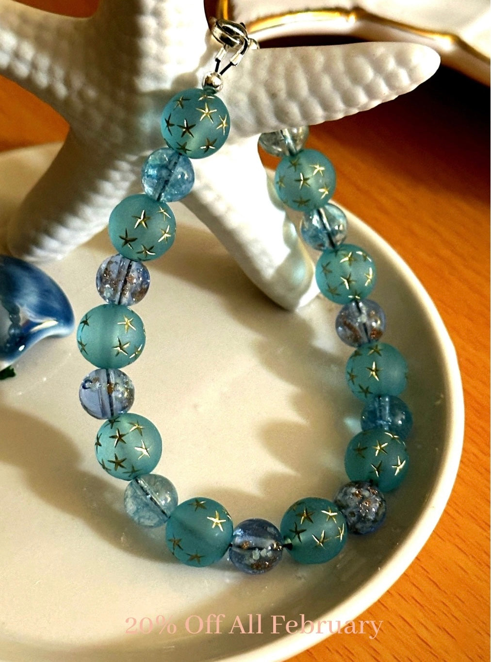 The Starfall Cove Bracelet features soothing ocean-blue glass beads paired with soft teal beads etched with delicate gold stars—each one catching the light like a falling wish. The colors are calm, grounding, and gently luminous, evoking quiet evenings by the water and the magic of watching stars drift into the tide.